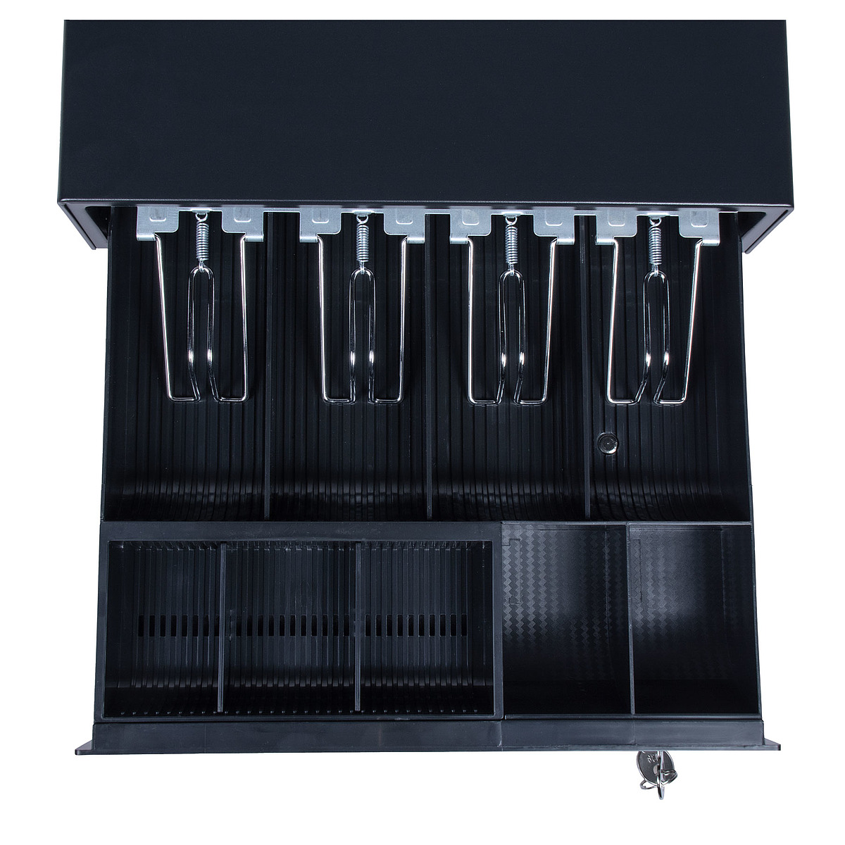 Внутри ящика предусмотрены четыре отделения для банкнот и пять отделений для монет, что позволяет удобно разместить и классифицировать денежные средства. Подключение кассы осуществляется при помощи 6-контактного разъема RJ11.